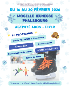Pour les jeunes de 11 à 17 ans qui veulent bouger pendant les vacances d’Hiver, voici le programme de la semaine Moselle Jeunesse : une sortie à l’Iceberg (patinoire de Strasbourg), des activités créatives, des jeux collectifs, du sport et une soirée de clôture pour finir la semaine en beauté !