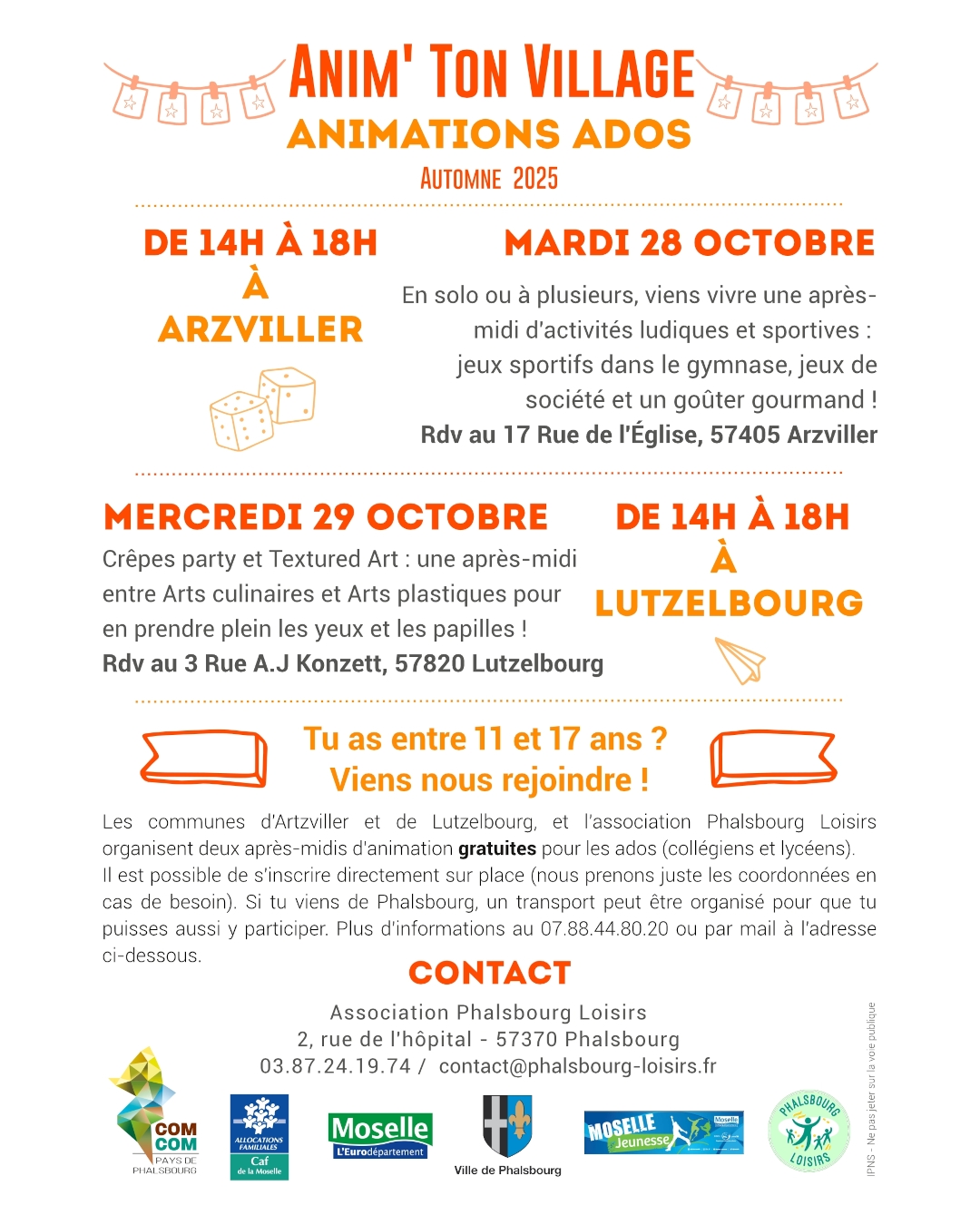 Durant les prochaines vacances, le projet « Anim’ ton village » se pose à Arzviller et à Lutzelbourg, pour des après-midis d’animation ados !