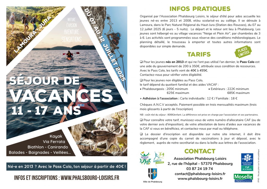 Tu as entre 11 et 17 ans ? Voici le programme du projet « Moselle Jeunesse » du 20 au 24 octobre 2025 dans nos locaux, à Phalsbourg. Une semaine d’activités variées, une sortie à Strasbourg entre jeunes, une équipe d’animation dédiée : c’est la recette pour des vacances réussies ! Pour s’inscrire, il suffit de télécharger le dossier « Club Ados » disponible ci-dessus et de contacter notre secrétariat par téléphone ou par mail à l’adresse ci-contre.