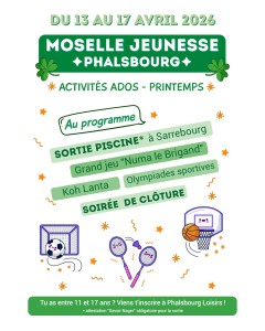 Voici le programme de la semaine Moselle Jeunesse des vacances de printemps : une sortie à la piscine de Sarrebourg (attention : attestation de savoir-nager obligatoire !), du sport, des activités ludiques et une soirée de clôture pour finir la semaine en beauté !